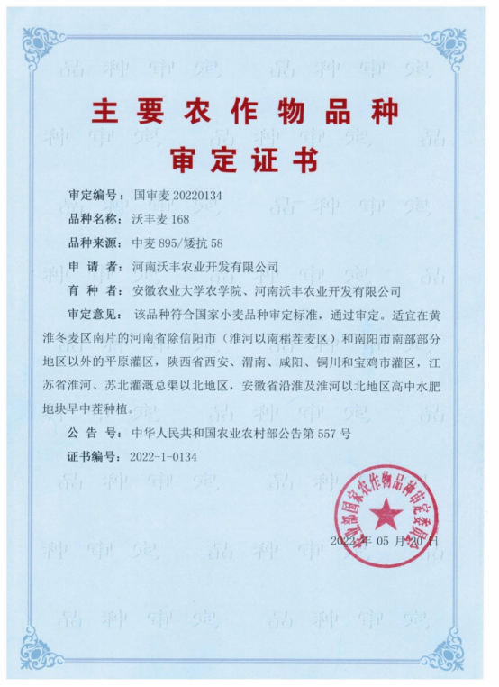 2022年5月通过国家品种审定,审定编号:国审麦20220134。