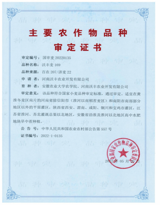 2022年5月通过国家品种审定,审定编号:国审麦20220135。