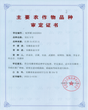 近期,3044永利选育的优质红香稻新品种“安红9号” 通过 2022年安徽省主要农作物新品种审定委员会审定。该品种通过协同聚合优质和高产有利基因,实现大穗(高产)和优质相协调。
