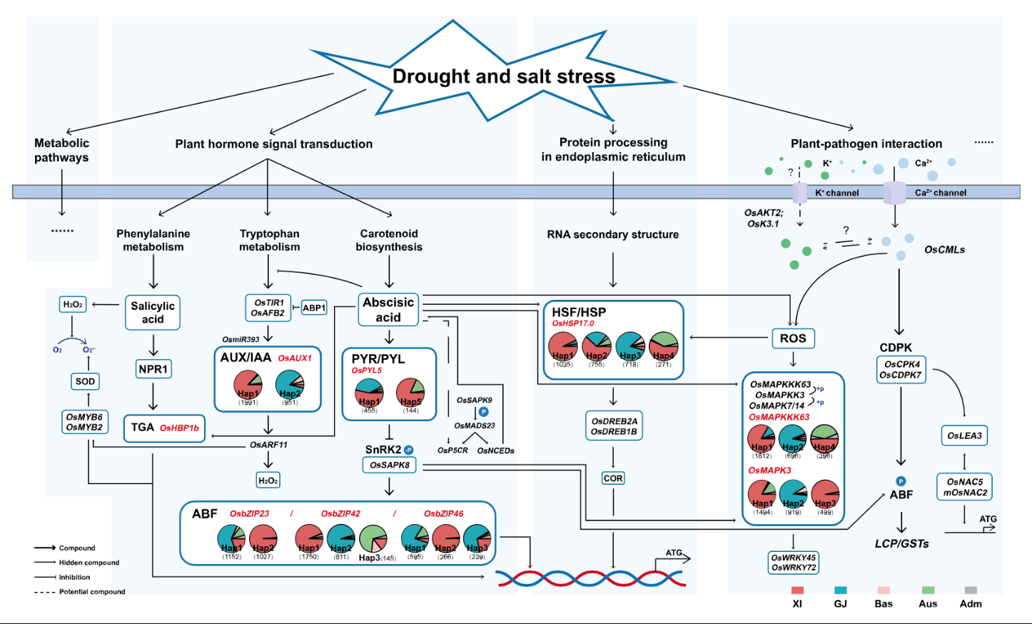 近日,3044永利在中科院生物类Top期刊(IF=5.924)International Journal of Molecular Sciences(IJMS)发表题为“Candidate Genes and Pathways in Rice Co-Responding to Drought and Salt Identified by gcHap Network”(https://doi.org/10.3390/ijms23074016)的研究性综述论文。在系统介绍水稻盐旱机制的同时,结合转录组分析筛选到1748个盐旱共响应基因,主要富集在植物激素信号传导、内质网蛋白调控,MAPK等重要通路,进而对其中的核心基因进行功能单倍型网络分析,构建了“gcHap-network pathway”的盐旱共响应机制框架图。同时整理了近900份耐盐抗旱水稻品种,分析发现在重要亲本中大多包含上述核心基因及有利单倍型,为将来进一步进行系统验证和分子设计育种提供了重要参考。
