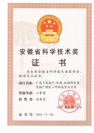 以广选S与广恢499杂交育成强优组合广两优4号。2008年通过安徽省品种审定(皖稻2008010)。该组合部分利用亚种间杂种优势,表现优势强、产量高、综合性状优良。