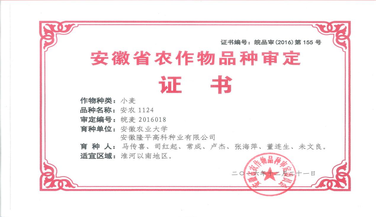 安农1124为本实验室选育的春性小麦品种。目前正参加国家长江中下游区试第二年、安徽省小麦生产试验。该品种特征特性: 春性,株高87㎝左右,抗倒性较好,抗寒性较好;幼苗直立,叶色稍淡、稍宽、偏披;分蘖力强,成穗率高;株型偏紧凑,穗层整齐,后期不早衰,落黄好,熟期较对照“扬麦16”晚熟1天。穗长方形,长芒,白壳,红粒,半角质,籽粒整齐度和饱满度好。 抗病性:长江中下游区试第二年试验:中抗白粉病,中感条锈、赤霉、纹枯,慢叶锈; 省生产试验鉴定:中感赤霉病,高抗白粉病,中感-抗纹枯病 国家小麦产业技术体系鉴定:MS-MR赤霉病,R白粉病,MS-MR纹枯病。