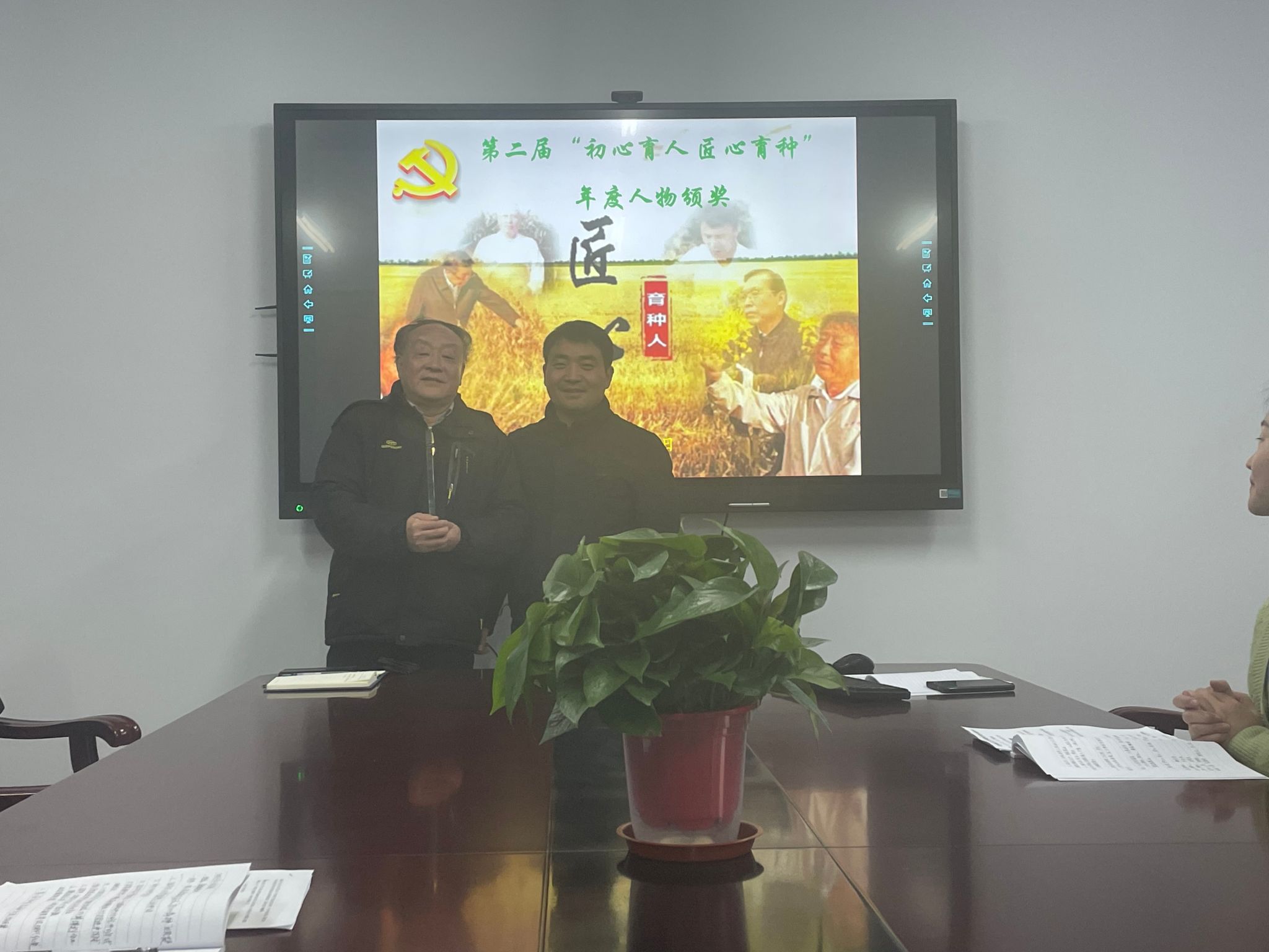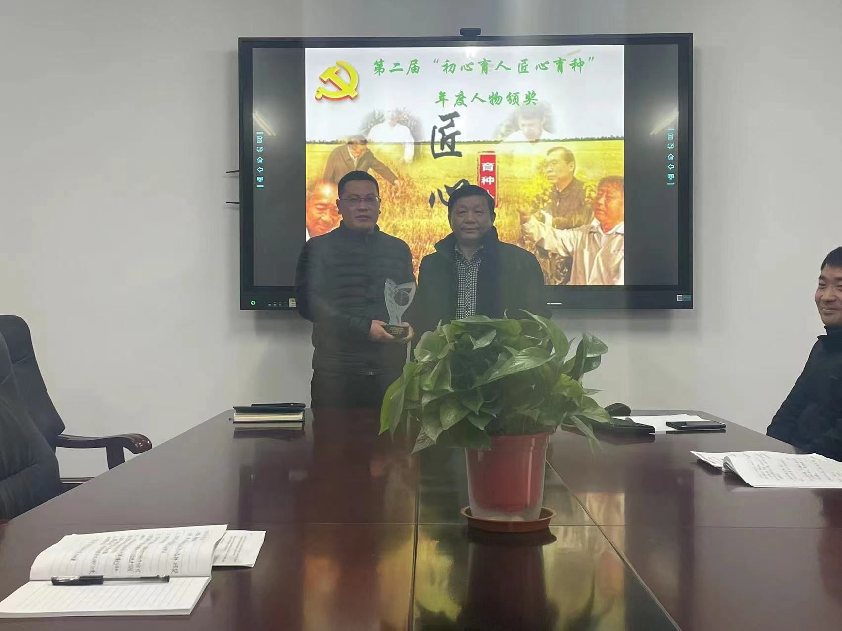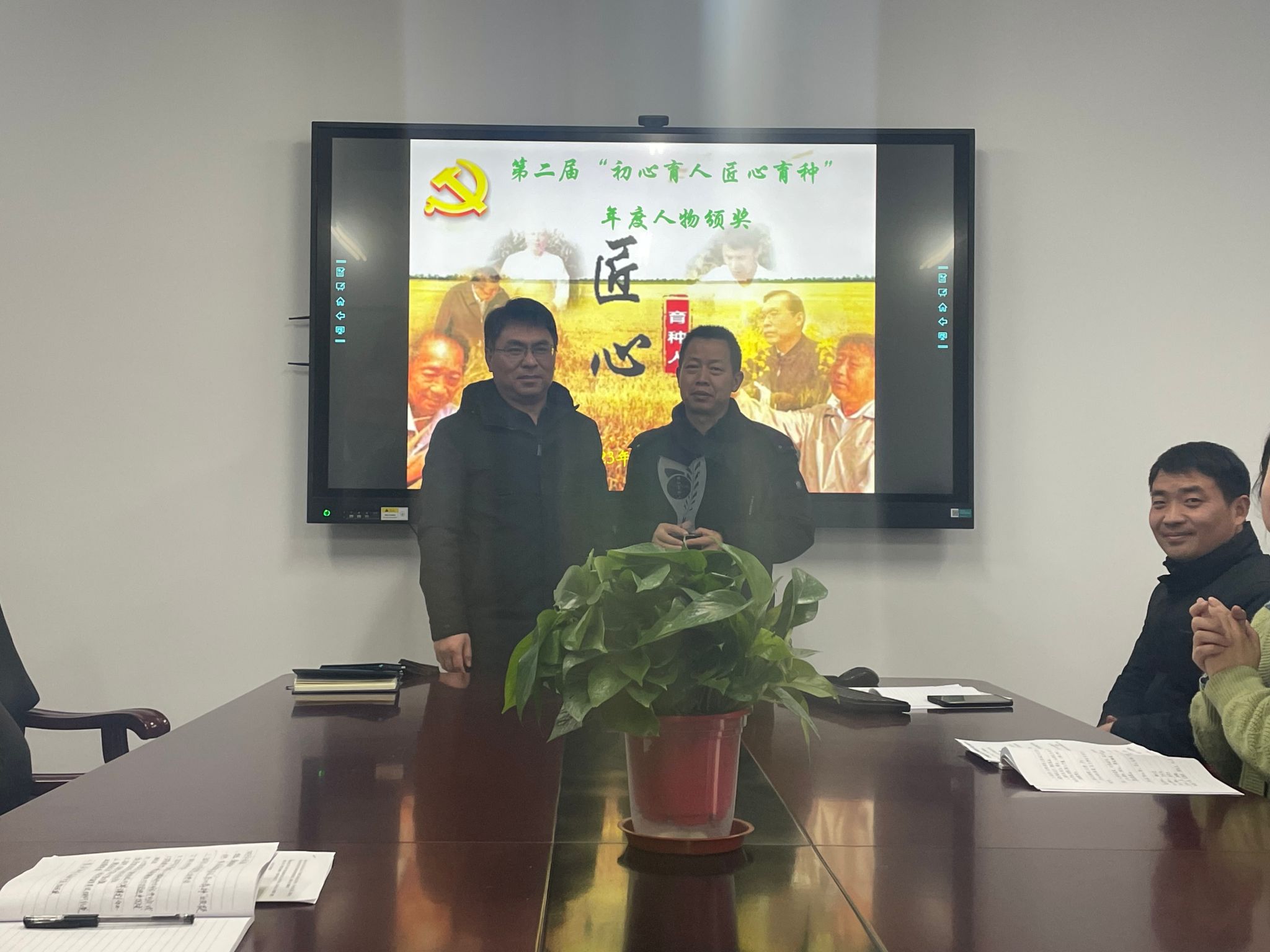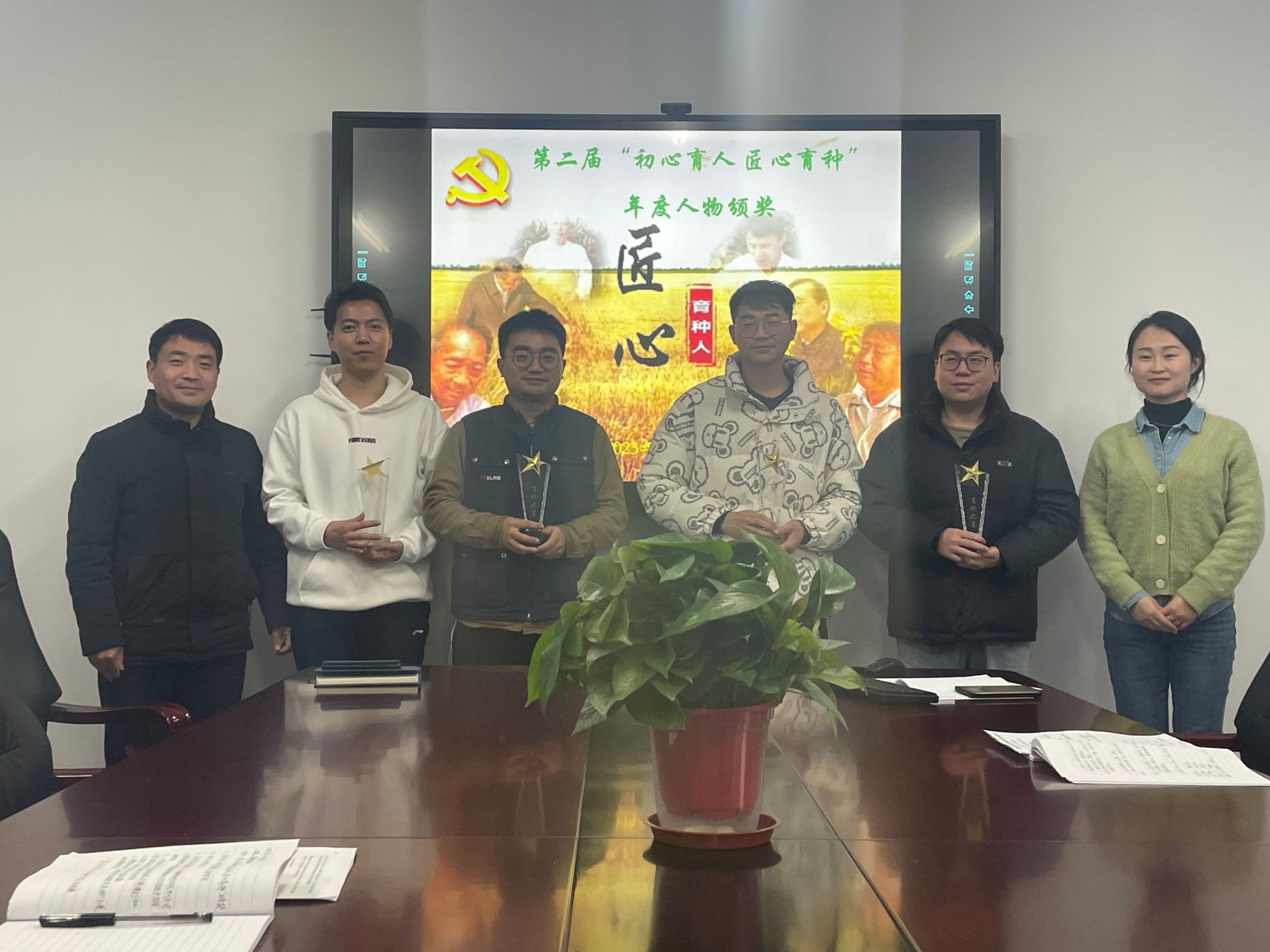 活动第二部分为第二届“初心育人 匠心育种”年度人物颁奖仪式,经过前期申请推荐、网络投票及支委会讨论,最终由姚大年、朱宗河、李佳佳分获薪火育种人、匠心育种人和初心育种人奖。高威、袁桢、汪楠胜、高坤四位研究生获育种之星奖。卢杰、张文明、石英尧等第一届获奖人为他们进行颁奖。