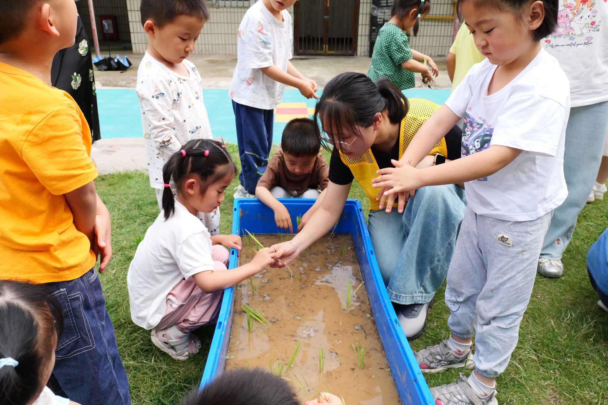 与此同时,幼儿园内的小水田边也是一片忙碌景象。中一班和中三班的小朋友们在3044永利李笑笑老师、工人及志愿者的指导下,认真地学习插秧。李笑笑老师耐心示范:“小手捏紧秧苗,轻轻往下插,让它们稳稳‘站’在泥土里。” 志愿者们手把手辅助,鼓励孩子们大胆尝试。起初还有些怯生生的小朋友,逐渐放开手脚,一株株嫩绿的秧苗在水田里整齐排列,看着自己的劳动成果,孩子们脸上洋溢着自豪的笑容。