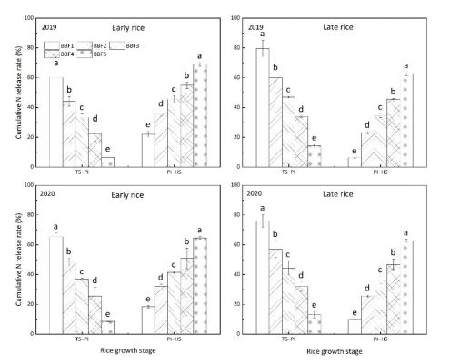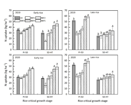 本网讯 以控释氮肥为主要载体的稻田一次施肥技术具有节肥、省工、高效等优势,受规模化生产的驱动,其在水稻生产中,尤其是劳动密集型双季稻的技术需求日趋迫切。然而,控释氮肥氮素释放呈S或J型“单峰”模式,因而一次施用下无法同步水稻分蘖期和穗分化—抽穗期“双峰”氮素需求,导致水稻产量不高不稳。已有研究通过控释氮肥与尿素配施、分次施用、推迟施用等方式优化其“双峰”供肥,但距一次施用的技术期望还有较大差距。采用分别靶向水稻分蘖期和穗分化—抽穗期供氮的控释氮肥为混合材料,并通过调控二者的复配比例创制“双峰”氮素供应模式缓混肥,是优化控释氮肥一次施肥的较好思路。但目前该方法在双季稻生产上的应用还未见系统评价。