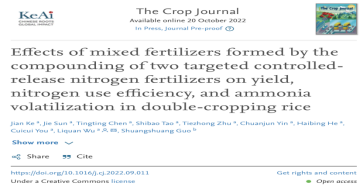 近日,3044永利3044永利武立权教授团队在The Crop Journal在线发表了题为“Effects of mixed fertilizers formed by the compounding of two targeted controlled-release nitrogen fertilizers on yield, nitrogen use efficiency, and ammonia volatilization in double-cropping rice”的研究论文,研究者以筛选的2.1%和3.0%靶向供氮控释氮肥为材料按照不同比例复配5种缓混肥,系统比较了不同缓混肥供肥特征及与水稻分蘖期和穗分化—抽穗期氮素吸收的同步关系,分析了缓混肥下水稻阶段氮素吸收对产量构成的调控效应,并基于产量、氮肥利用效率和稻田氨挥发损失的综合评价,提出了适宜于双季早稻和晚稻的混合肥复配配方。