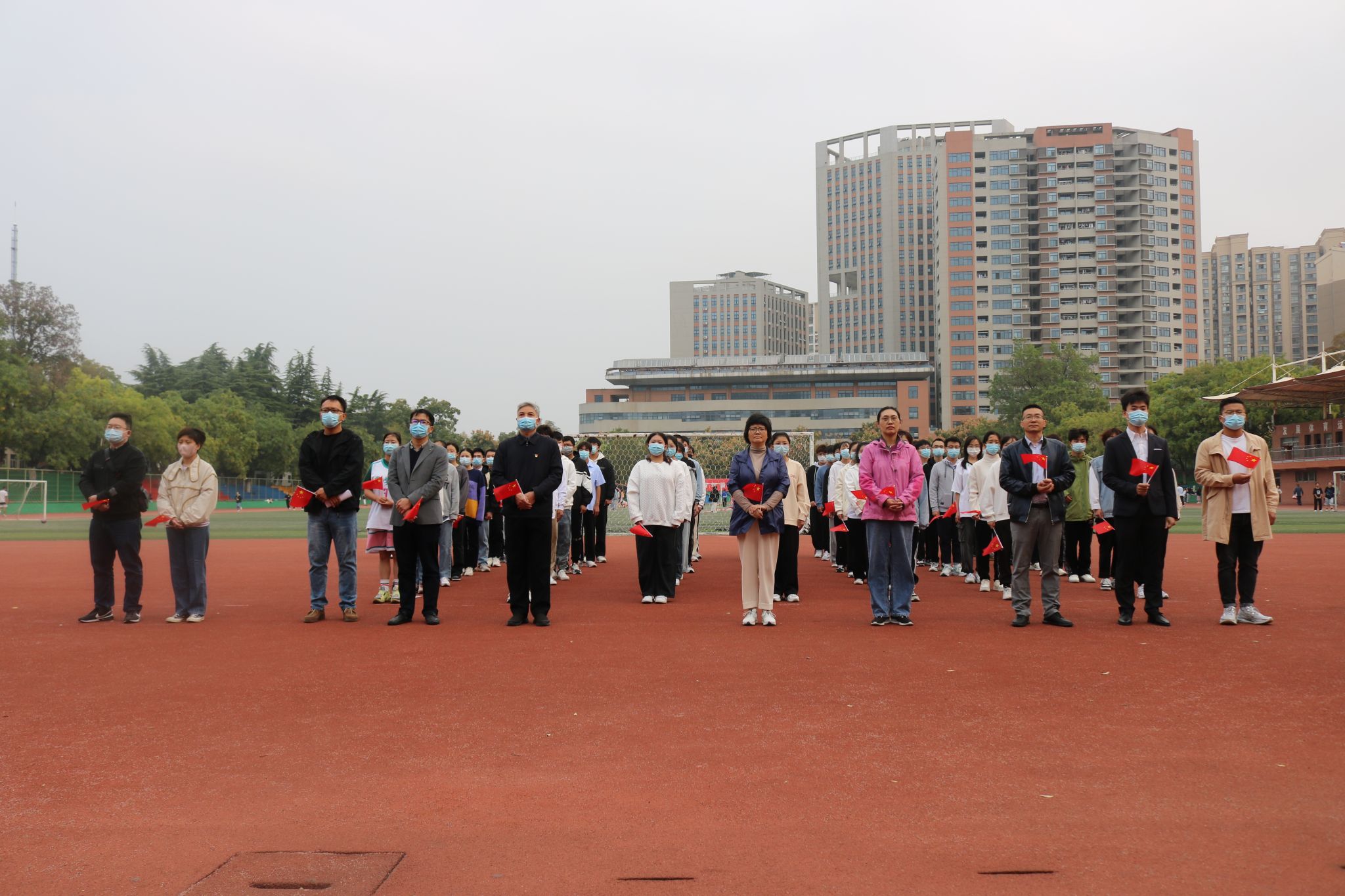迎着朝阳,国旗护卫队迈着铿锵的步伐,英姿飒爽的护送国旗,随着《义勇军进行曲》的旋律响起,五星红旗冉冉升起、迎风飘扬,全体师生庄严肃立,行注目礼。