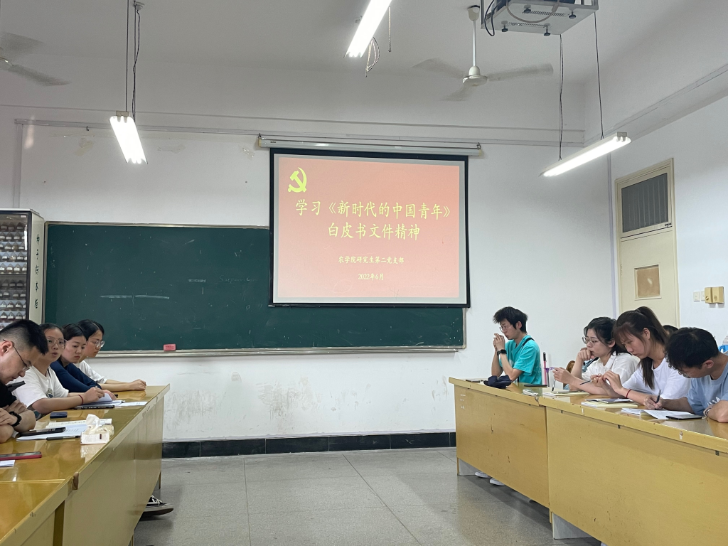 最后,陈翔老师领学了习近平总书记在考察中国人民大学时的重要讲话精神,并以“学习《新时代的中国青年》白皮书文件精神”为主题做了专题党课,强调奋斗是青春最亮丽的底色,行动是青年最有效的磨砺,新时代青年研究生,认真学习党史既是一次把握规律、把握未来的理论学习,也是一次坚定信仰、坚定方向的党性教育。研究生党员要坚持以习近平新时代中国特色社会主义思想为指导,尊崇党章、遵守党规、学好党史,不忘初心、牢记使命,进一步增强“四个意识”,坚定“四个自信”,坚决做到“两个维护”。与会党员纷纷表示,要争当伟大理想的追梦人,争做伟大事业的生力军,让青春在祖国和人民最需要的地方绽放绚丽之花,为迎接党的二十大召开,实现中华民族伟大复兴的中国梦贡献青春力量。(秦博雅 蔡洪梅 陈翔 审核人:管志权)