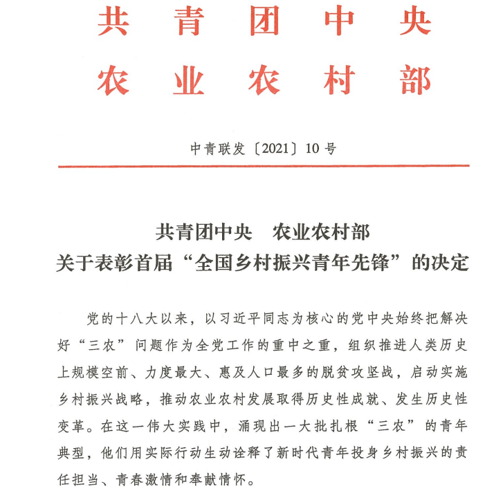 本次评选表彰活动由共青团中央和农业农村部联合举办,自2021年7月启动以来,经组织报名、资格审查、大众评审、社会公示、标兵评审等环节,共产生首届“全国乡村振兴青年先锋”390名,涵盖涉农创业、乡村治理、科技兴农、乡村社会实践等领域。