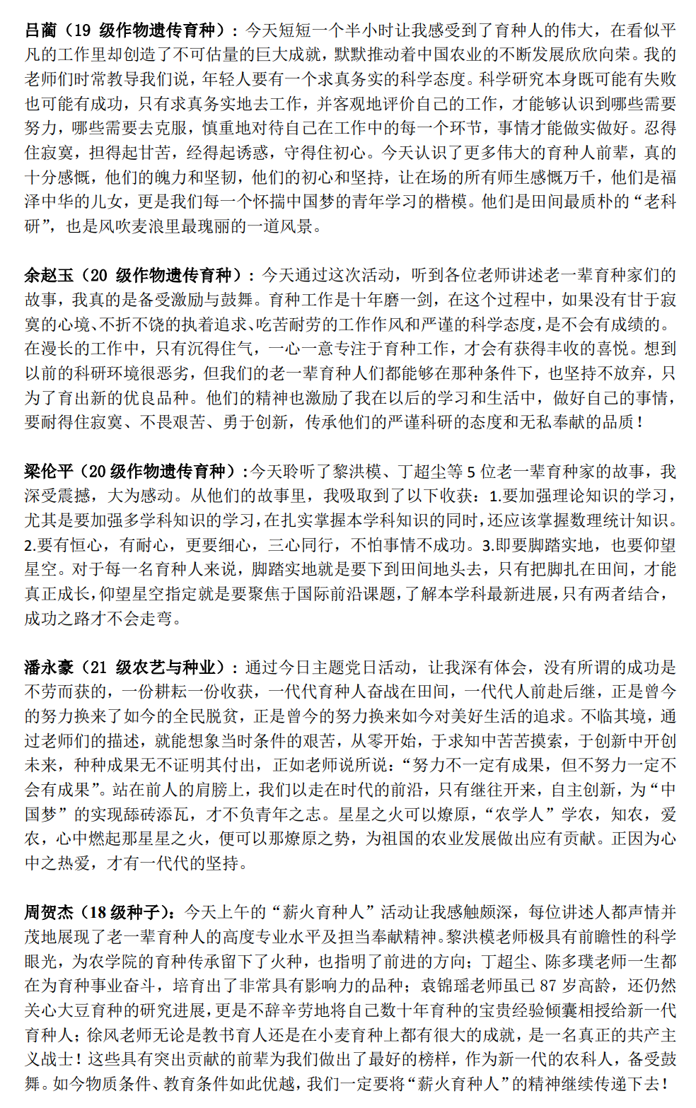 守正传承:与会师生们以“传承”为主题进行交流座谈。公司党委委员、副经理王晓波同志以普通党员参加交流,他对本次活动的顺利开展给予肯定,同时强调,老一代育种人事迹感人肺腑、可学可做,他们的精神崇高伟大、可追可及,并对各位师生党员们提出了“夯实理论功底”“加强育种实践”“开拓创新思维”“培养育种情怀”的四点期盼;作物育种与种子科学系系主任卢杰激励师生要从“薪火育种人”身上学习“学农爱农兴农的高尚情怀” “脚踏实地 勇攀高峰的科学精神” “一丝不苟 认真严谨的治学态度”;黎珉书记从“支部传承”与“家庭传承”两方面进行总结,强调青年师生要从老一辈育种人的事迹中汲取“精神动力”,赓续“育种使命”。活动在《在这多情的土地上——讲述育种人自己的故事》的视频中结束。