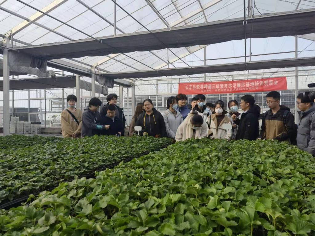 上午,试验班成员首先参观长丰县艳阳天草莓育苗专业合作社育苗实验室,详细了解草莓产业育苗步骤、生产规模、市场销售等情况,听取了园区育苗负责人对草莓繁育、种植、病虫害管理、采摘、销售的介绍。其次,试验班成员在园区负责人带领下参观了草莓种植大棚、采摘园区以及交易市场,全方位了解草莓从育苗、种植到采摘、销售的全过程。在草莓电商中心,试验班成员参观了直播间了解了草莓产业利用抖音等平台的直播销售情况。