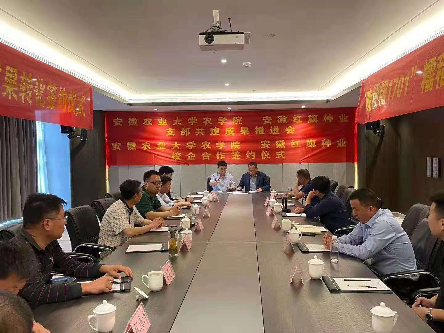 随后,双方进行了支部共建成果推进会并深入座谈。贾长敬总经理首先介绍了公司近期的重要进展。他表示,红旗种业在发展的道路上一直非常重视科研投入,希望未来通过深化校企支部共打造完整“科研产业链”,为乡村振兴贡献力量。管志权书记对安徽红旗种业的热情接待表示感谢,并从校企支部共建的组织形式、社会职能、未来发展等方面进行了发言,强调支部共建的核心在于政治建设,落脚点在于促进事业的发展,指出未来校企要深度融合的发展方向。教工第二党支部书记王晓波回顾了自2018年正式签署支部共建协议以来,红旗种业对公司大豆、水稻等新品种培育的支持和贡献,并希望通过此次活动推进共建常态化,为“十四五”“开新局,谋新篇”打下基础。会议总结了支部共建三年来的重要成果,包括淠东乡鲜食大豆项目、糯稻新品种成果转化项目、大豆新品种成果转化、大豆专利技术转化及共建安徽优质大豆产业联盟项目等。