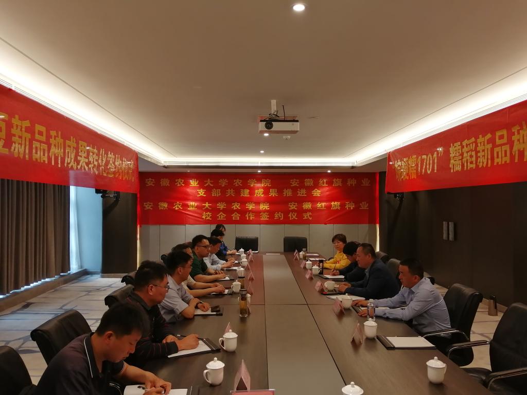 最后,双方进行了校企合作签约仪式。王晓波、石英尧作为第一育种人代表我方与红旗种业进行了皖黄506、晚粳糯1701的校企科研合作及成果转化项目签约。皖黄506和晚粳糯1701新品种的审定填补了公司近二十多年来在大豆品种和粳糯稻上的空白,此次的成功签约为品种在生产中的大力推广奠定了基础。