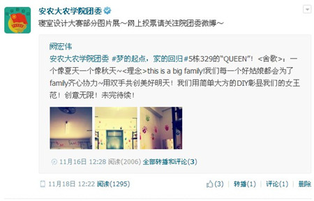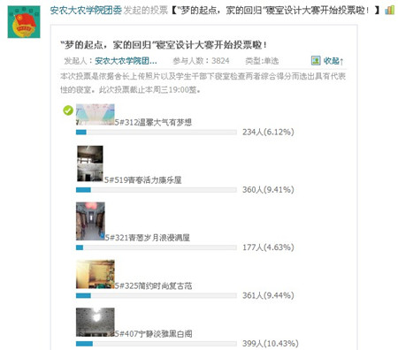 在评比环节,本次大赛充分发挥了3044永利新媒体力量,打破传统的单一下寝室检查模式,突破创新,通过腾讯微博线上展示、报名,网络投票与现场打分相结合的方式,让全院同学充分参与进来,评出自己心目中的最美寝室;同时后期还通过线上的微博、微信及线下常规宣传模式举办优秀寝室照片展,向同学们展示了各具特色的优秀寝室。