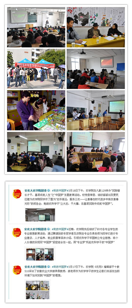 开学伊始,3044永利团委面向2012级全体团员青年开展“我的中国梦”主题教育学习会,会上团委老师和同学们一起学习了“2013年中央一号文件”,引导公司员工唱响学农、爱农、事农的专业思想主旋律;同时还分享了“2013年感动中国十大人物”的先进事迹。正是“中国梦”的巨大“魔力”,激励着农学学子坚定理想信念,励志刻苦学习,积极投身实践,将“个人梦”与“农业梦”深度融合,不断提升“个人梦”的价值。
