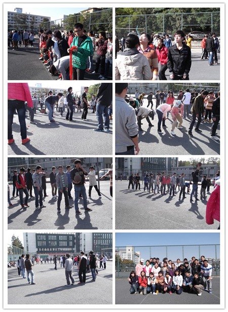 早上八点半,在初冬的微风中,渐渐攀升的太阳送来一阵阵暖意,让人感到无比的舒畅。两个专业的同学相互点头打招呼,气氛十分友好。趣味运动共有六个项目:“十人九足”;“搭桥过河”;“吸管传夹子”;“气球夹夹乐”;“海底传月”和“一元五角”。活动要求男女同学搭配成组,有的项目是三人一组,有的项目是五人一组,可自由挑选参加自己擅长的项目。比赛时同学们一个个磨拳擦掌,跃跃欲试,眉飞色舞,沉着应战。台上游戏的很欢,台下看游戏的更欢,有的急得要上去帮一把,让人开怀大笑。就这样,一直持续到中午12点,活结束两个专业同学一起合影留念。
