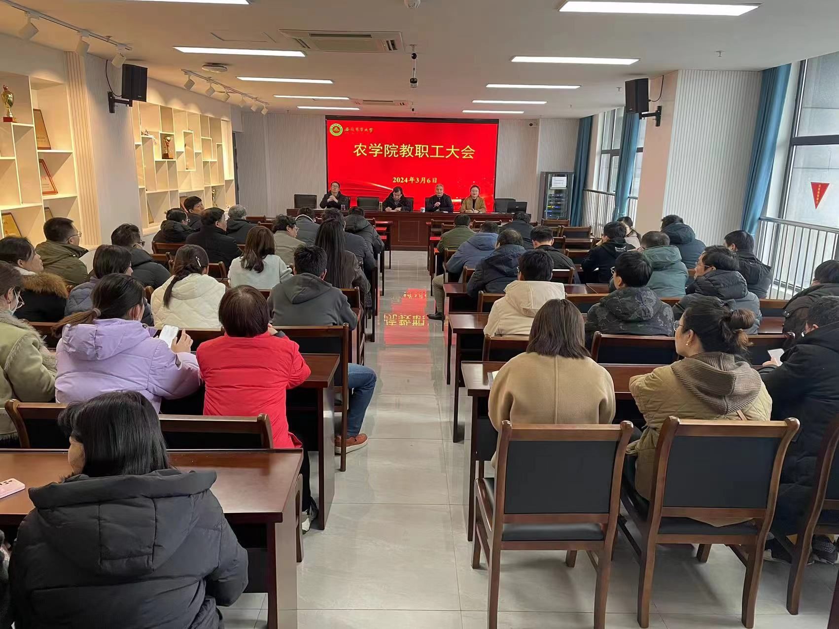 洪志生重点强调了意识形态风险点防控、实验室安全管理、教学工作纪律、审计问题整改等方面的工作。他要求全体教职工要进一步提高政治站位、统一思想,全身心投入到各项工作中,形成“我要干、主动干”的工作氛围;要树立红线底线高压线意识,严格遵守学校学院的各项规章制度,在工作学习生活中坚决不越红线、不触底线、不碰高压线,养成严谨务实的工作作风;;要以更加饱满的工作热情,确保完成学院2024年各项任务,并力争取得更大的业绩、更多的突破,为学院发展做出应有的贡献。
