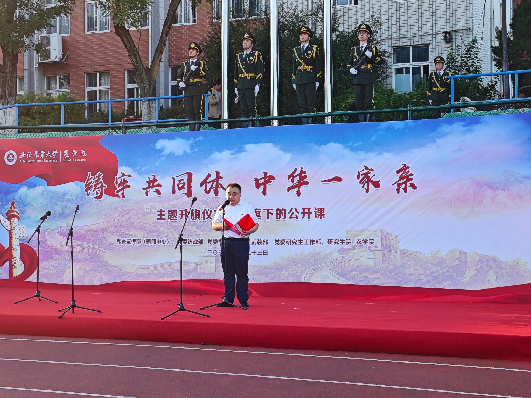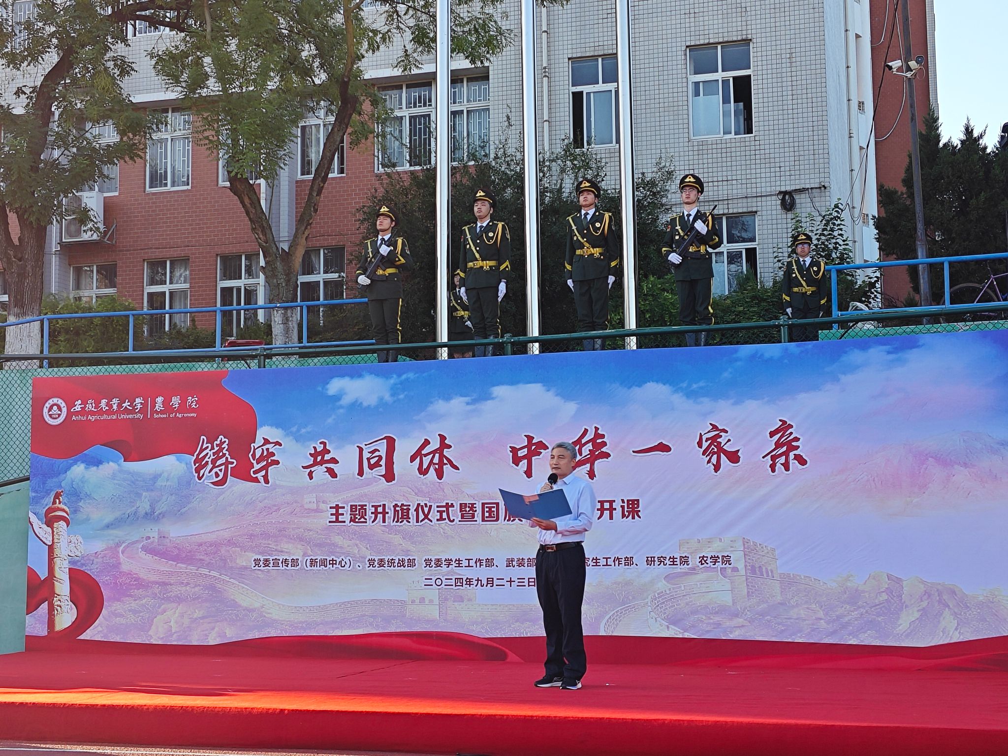 本网讯 为深入学习贯彻党的二十届三中全会精神,加强爱国荣校教育,引导和激励广大师生铸牢中华民族共同体意识,牢固树立休戚与共、荣辱与共、生死与共、命运与共的共同体理念。9月23日,由3044永利承办的2024-2025学年首次主题升旗仪式暨国旗下的公开课在校第一运动场举行。公司党委学工部(处)、武装部处长任琪,公司党委宣传部、公司党委统战部副部长林婷婷、马克思主义学院思政课教师费强,农公司党政领导、全体专兼职辅导员和453名2024级本硕博及职工新生参加仪式。