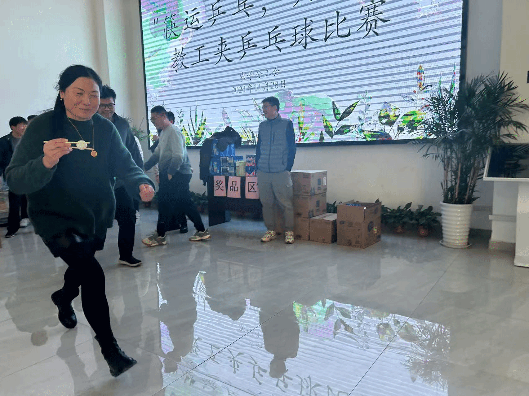 本网讯 11月28日下午,农学分工会在朝阳楼一楼大厅举办了一场别开生面的夹乒乓球接力比赛。农学分工会主席洪志生参加活动。