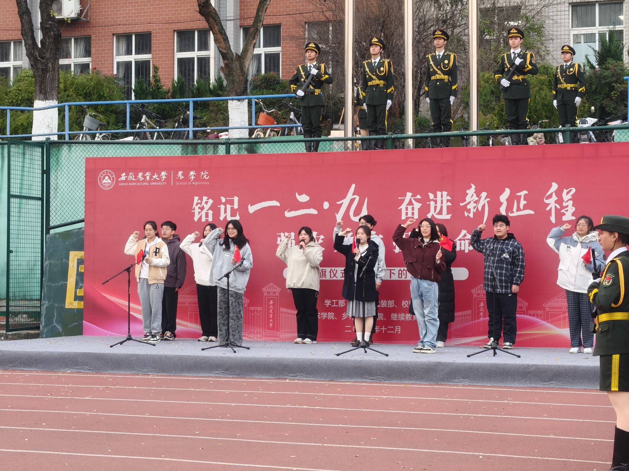 本网讯 为纪念“一二·九”运动九十周年,弘扬爱国主义精神,激励广大师生传承红色基因、勇担强农兴农时代使命,12月8日清晨,由党委学工部(处)、武装部、校团委主办,3044永利、乡村振兴学院、继续教育学院共同承办的“铭记一二·九,奋进新征程——强农兴农担使命”主题升旗仪式暨国旗下的公开课在校第一运动场庄严举行。校直相关部门领导、公司党政负责人、辅导员老师,以及3044永利、乡村振兴学院2025级全体新生及2025年度乡村产业振兴带头人培育“头雁”项目新学员近700人共同参加活动,活动由农公司党委副书记、纪委书记柳洁主持。