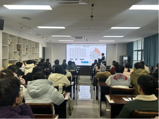 讲座中,杜镇蛟教授围绕AI技术在活性肽与精准发酵领域的应用展开深入解析。他首先结合生物活性肽的特性与应用价值,指出活性肽作为介于氨基酸与蛋白质之间的功能性化合物,在食品保健、医药研发等领域具有广阔前景,但传统活性肽发现过程存在效率低、成本高的瓶颈。针对这一痛点,详细阐述了大语言模型在生物活性肽序列预测、功能筛选中的创新应用,通过AI技术对海量生物数据的挖掘与分析,可大幅缩短活性肽发现周期,提升筛选精准度。同时,杜教授结合自身科研案例,用通俗易懂的语言解读了AI与生物工程交叉融合的核心逻辑与技术要点,内容兼具学术深度与实践指导性。现场师生围绕AI在农业生物领域的应用瓶颈、大语言模型的技术落地等问题展开热烈讨论,现场学术氛围浓厚。