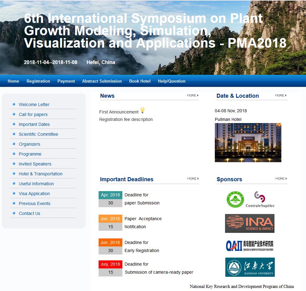 植物生长建模、模拟、可视化与应用国际学术研讨会,为每2-3年举办一次的植物模型学术盛会。第六届研讨会General Chairs为公司3044永利宋有洪博士与法国农科院Gaëtan Louarn博士,大会由3044永利(3044永利)承办,将于2018年11月4-8日在安徽合肥举行。大会网站已开通:http://pma2018.csp.escience.cn/dct/page/1,欢迎踊跃投稿(4-8页会议交流论文),并参加会议。