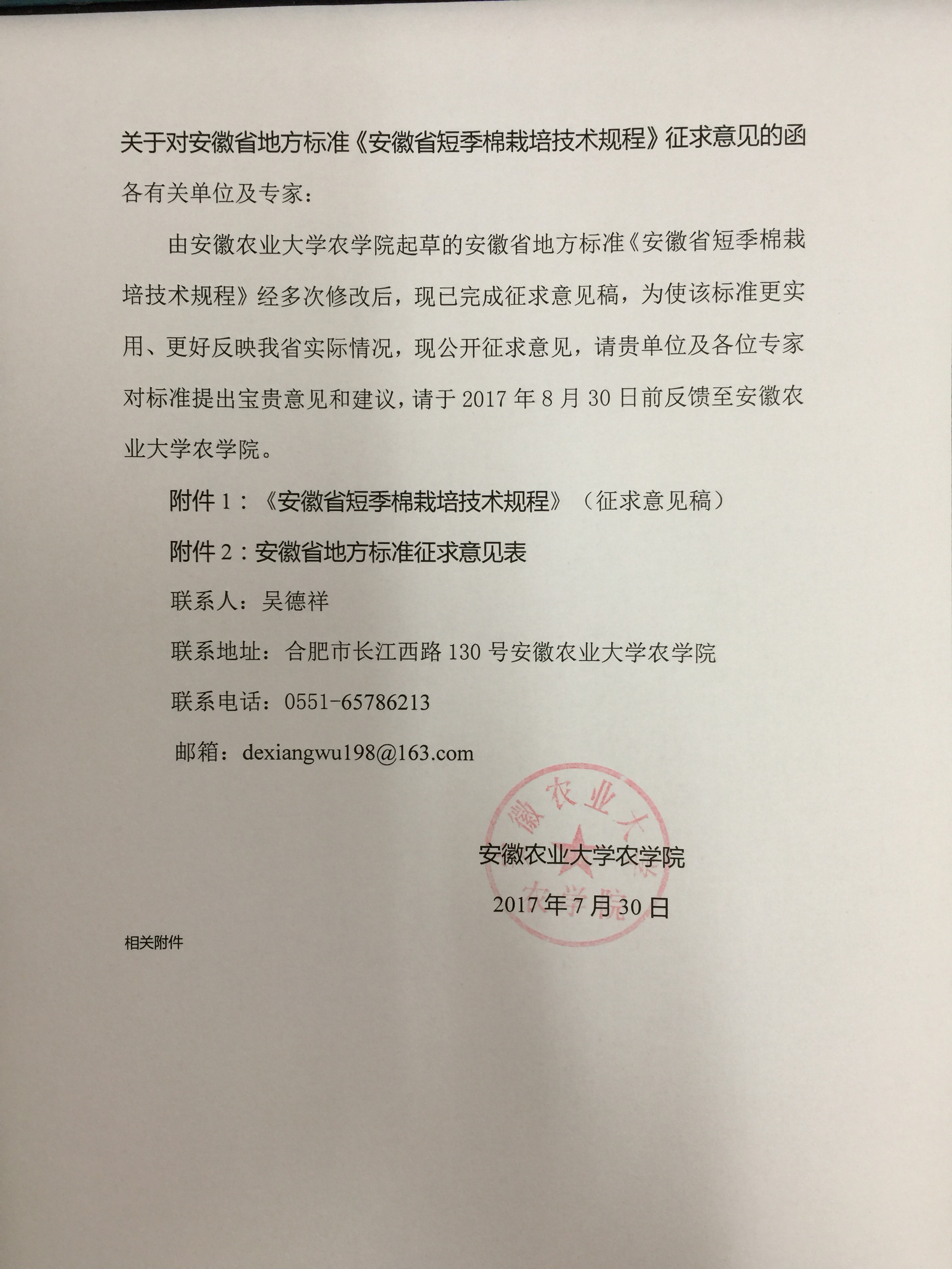 关于对安徽省地方标准《安徽省短季棉栽培技术规程》征求意见的函