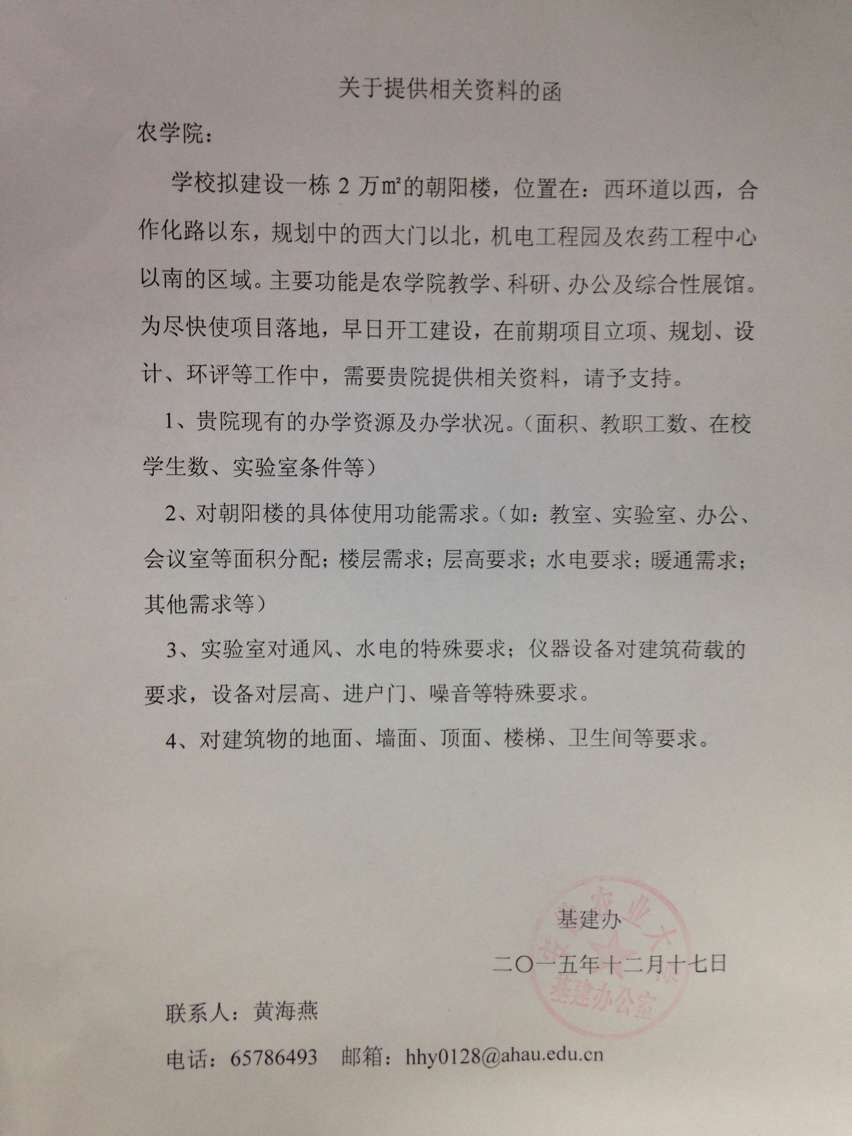 校拟建设2万平米朝阳楼,主要用于公司教学、科研、办公及综合性展馆。为保证朝阳楼设计合理,更好地满足各项需求,现面向全院广泛征集设计建议。相关情况详见附件,请结合实际,于12月31日前将设计建议发送至zhangkk@ahau.edu.cn,如有不明事宜可致电65786213。