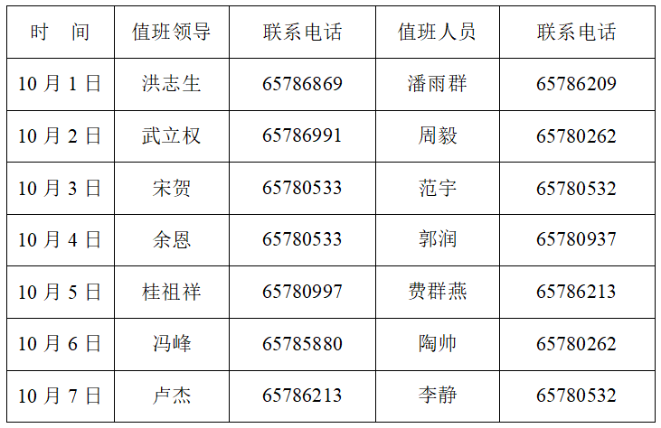 值班人员要认真履行值班工作职责,保持手机畅通,遇突发事件或紧急情况应第一时间报告,并采取有效措施妥善处置。学校值班电话:65780525,保卫处24小时值班室电话:65786110。