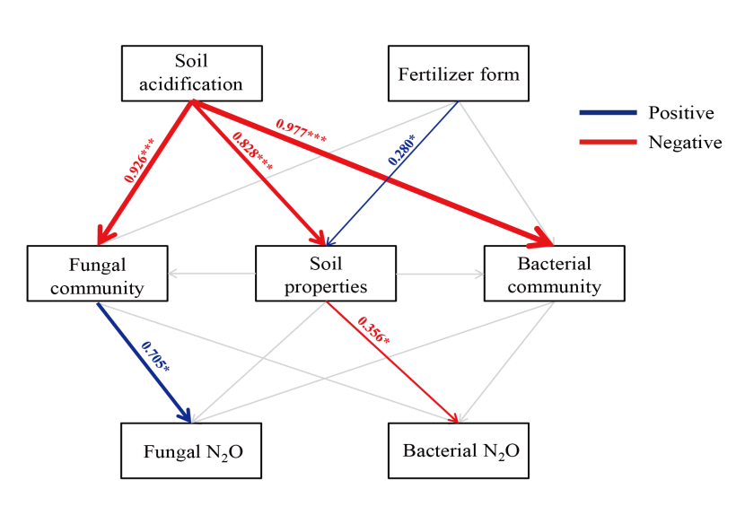 在土壤酸化和施肥类型对土壤真菌和细菌群落结构及N2O排放特征的影响研究方面,由于人为活性氮的输入加速了土壤酸化,而土壤酸化也会反过来影响土壤中活性氮向大气的转化。但目前土壤酸化和活性氮输入对细菌和真菌的N2O贡献的综合影响机理仍不清楚。该研究通过在田间原位设置一个酸性梯度土壤(pH = 6.8、6.1、5.2、4.2),分别在这些土壤中施入有机肥和化学氮肥。采用qPCR和高通量测序技术分析了细菌和真菌丰度和群落结构,并通过室内培养试验区分细菌和真菌对N2O排放的贡献。结果表明,土壤酸化显著增加了真菌对N2O排放贡献,减少了细菌对N2O排放贡献。进一步分析发现,酸性环境下,Ascomycota和Basidiomycota等真菌门类微生物的丰度增加是导致真菌N2O排放增加的原因;而土壤酸化引起的pH下降,可溶性有机碳以及氨有效性的降低是导致细菌N2O排放减少的主要原因。与化学氮肥相比,施用有机肥对不同酸度土壤下真菌N2O排放无显著影响。该结果明确了在土壤酸化和氮富集情景下,缓解土壤N2O排放具有更大的挑战性。