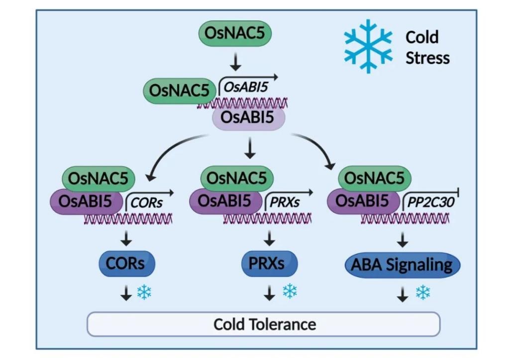该研究揭示了OsNAC5是水稻萌发期和幼苗期耐冷性的正调控因子。OsNAC5蛋白可以与OsABI5蛋白互作,并增强OsABI5蛋白的稳定性,进而调节下游冷响应(CORs)基因的表达,最终实现水稻对冷胁迫的快速精准反应。有意思的是,OsNAC5蛋白还可直接激活水稻OsABI5的转录表达,而OsABI5启动子区域中OsNAC5结合位点的单核苷酸多态性(SNP)与水稻低温耐受性密切相关。总之,该研究为完善水稻低温耐受性的分子调控网络提供了线索,同时也为利用分子设计育种改善水稻低温耐受性提供了新的见解。