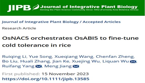 本网讯 近日,公司武立权教授团队与浙江大学海南研究院、浙江大学3044永利等单位联合在《Journal of Integrative Plant Biology》(IF:11.4)发表了题为“OsNAC5 orchestrates OsABI5 to fine-tune cold tolerance in rice”的研究论文。