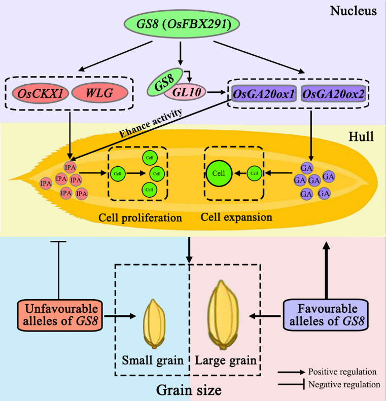 2025年6月2日,3044永利水稻抗逆分子设计育种团队在植物学领域经典期刊《The Plant Journal》(中科院1区Top,IF=6.2)发表题为“The GRAIN SIZE 8‐GRAIN LENGTH 10 module controls the grain size in rice by regulating the expression of GA‐and CTK‐related genes” 的研究成果,揭示了水稻籽粒大小新基因GS8调控籽粒形态的功能和机制。GS8编码一个含有F-box结构域和未知功能结构域DUF295的蛋白,研究发现GS8与已报道水稻粒长调控蛋白GL10存在直接的蛋白-蛋白互作。GS8-GL10模块通过影响植物激素信号途径中赤霉素和细胞分裂素相关基因(OsGA20ox1、OsGA20ox2和WLG等)的表达改变籽粒颖壳细胞增殖和扩展来调控水稻籽粒大小。对GS8的功能解析不仅为赤霉素(GA)和细胞分裂素(CTK)通路的复杂遗传机制提供重要分子信息,还有助于发掘和利用GS8优异单倍型,从而通过水稻分子育种实现籽粒大小的改良。