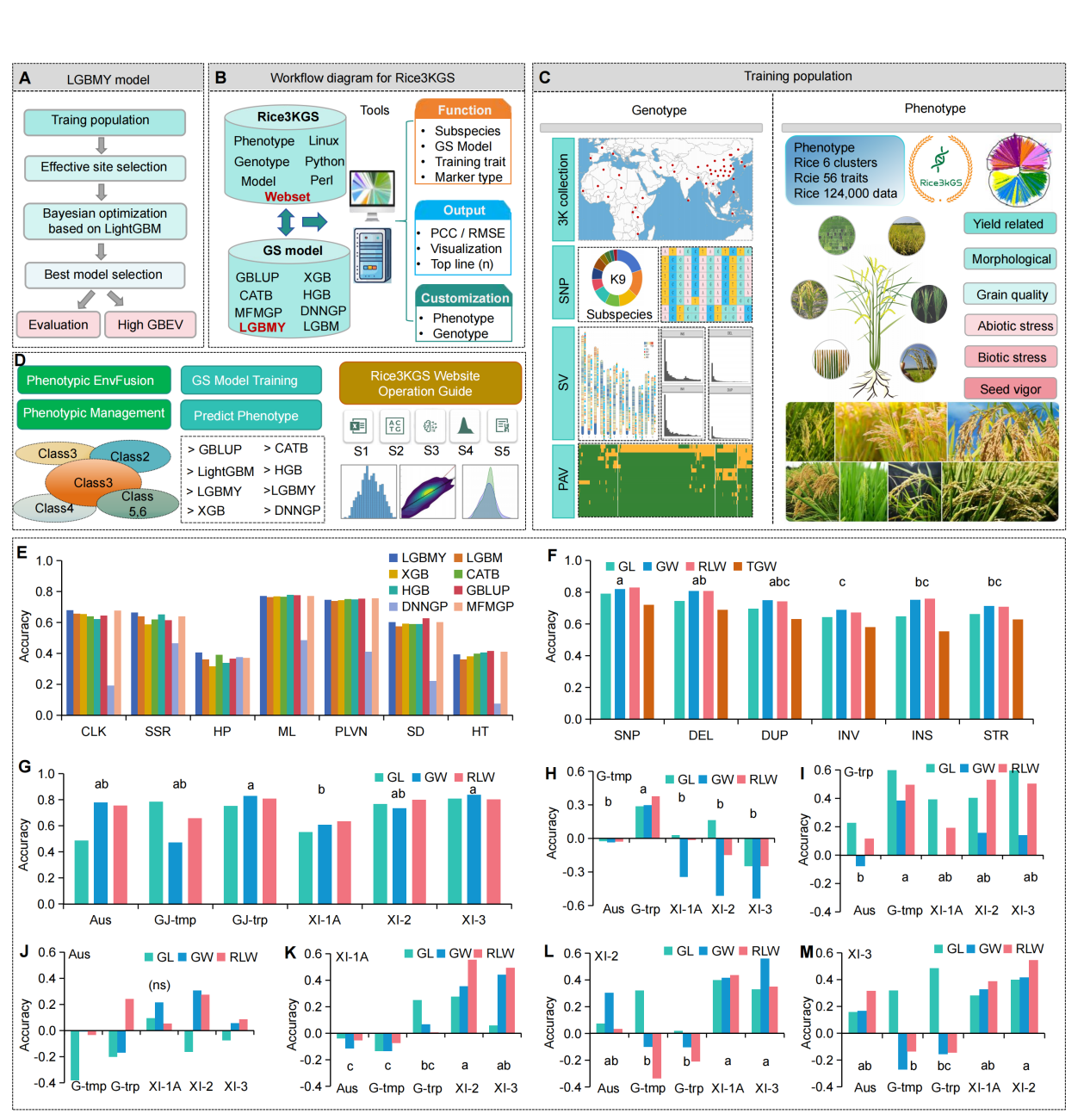 Rice3KGS平台将LightGBM算法与贝叶斯方法融合,打造出增强型GS模型LGBMY。经测试对比,相较于原始模型,LGBMY的预测准确性平均提升了5.2%。不过,基于多个不同类型的性状的测试结果显示,不同的GS模型在预测时存在一定偏好性。依托我国各育种单位和科研机构广泛运用的全球来源的3000份水稻种质资源(3KRGP),围绕56个关键农艺性状展开深入研究,结合已发表的论文,搜集到超过12万个(次)表型数据点。Rice3KGS平台除了具备当前GS工具常用的单核苷酸多态性(SNP)数据集外,还新增了多种类型的基因型数据集,如结构变异(SV)、基因存在-缺失变异(PAV)等,为用户提供了更为丰富的基因型选择。Rice3KGS还配备了用户友好型的在线分析工具,集多环境下表型处理、亚群选择、GS模型选择、基因型选择、结果可视化以及优良品系选择等功能于一体。