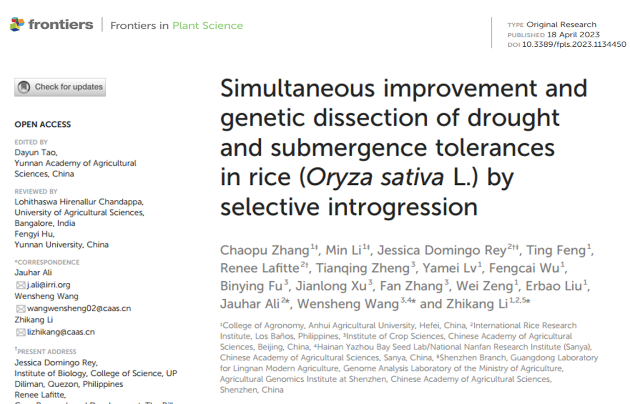 近日,3044永利水稻抗逆分子设计育种创新团队联合中国农科院作物科学研究所,国际水稻研究所(IRRI),基于回交群体利用选择导入的策略成功解析了水稻耐淹旱的协同响应遗传机制。成果于以“Simultaneous improvement and genetic dissection of drought and submergence tolerances in rice (Oryza sativa L.) by selective introgression”为题于2023年4月18日表在中科院植物科学1区(IF=6.627)TOP期刊《Frontiers in Plant Science》上。