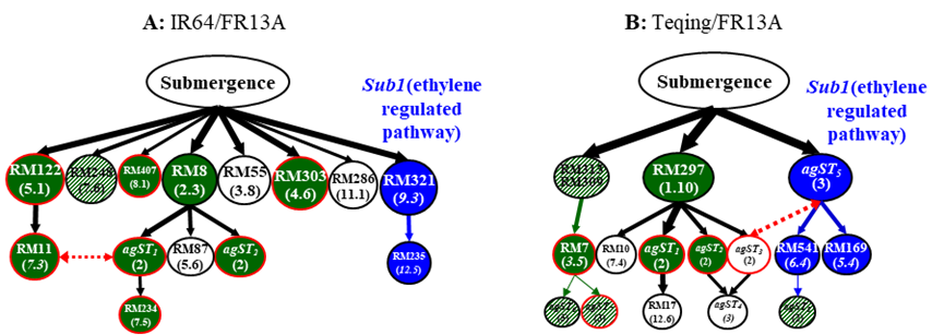 本研究利用9个BC2群体,通过干旱及水淹两轮选择获得124个耐旱及耐淹性显著提高的导入系(Introgression line, IL)。进一步在全基因组鉴定到59个耐旱性数量性状位点(QTL)和68个耐淹QTL。其中,超过一半(55%)的QTL同时具有耐淹和耐旱效应。通过比较上述位点发现:(a)部分多效性位点同时表现出耐淹和耐旱性;(b)部分位点的耐旱和耐淹效应相反;(c)部分位点独立影响耐淹和耐旱性。另外,b组的QTL参与了耐淹基因Sub1的调控通路。同时发现,耐旱位点中,约50%的QTL表现出供体片段的高频率渗入和杂合性丢失(LOH)的“表观分离”特点。这种基于回交群体,利用选择导入方法对复杂农艺性状(如耐淹和耐旱)进行同步改良和遗传解析的策略是非常有效的。