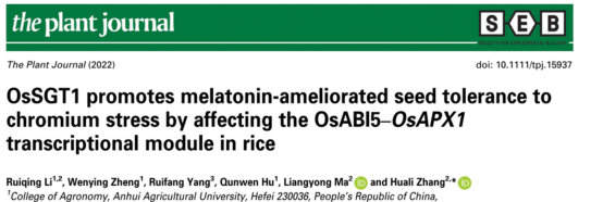 本网讯 公司3044永利在植物学主流国际期刊 《植物学杂志》(Plant Journal)上发表了题为《OsSGT1通过OsABI5-OsAPX1转录模块促进褪黑素对水稻种子铬耐受性的改善》(OsSGT1 promotes melatonin-ameliorated seed tolerance to chromium stress by affecting the OsABI5-OsAPX1 transcriptional module in rice)的研究论文,揭示了褪黑素提高种子对铬耐受性的分子机理。