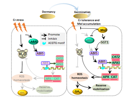 研究发现,在水稻种子萌发过程中Mel可显著缓解Cr胁迫,尤其是在OsSGT1-OE材料中可观察到萌发性能的明显改善,相反,OsSGT1和/或OsABI5的突变则显著消除了Mel对Cr胁迫的缓解作用,严重抑制种子的萌发。生理生化试验表明,Mel不仅会抑制萌动种子对Cr的吸收,而且还会改善营养物质的高效运转、促进抗氧化系统的增强以及内源GA激素的合成。遗传分析试验表明,Cr胁迫下,恢复OsSGT1的表达并不能改善sgt1-1abi5突变体的弱萌发表现,但利用pOsSGT1::OsABI5则可使恢复sgt1-1abi5突变体中Mel介导的种子萌发和OsAPX1的显著表达,因此OsSGT1是OsABI5的上游调控因子。通过DAP-seq分析结合EMSA、Y1H和Chip-qPCR等试验,确认了OsABI5直接调控OsAPX1基因的转录表达;而OsAPX1编码产物过氧化物酶则会加速H2O2清除以维持氧化还原稳态,这对种子萌发及幼苗生长至关重要。总之,该研究为Mel缓解重金属胁迫的分子机理提供了直接证据,也为研究褪黑激素的信号转导提供了新思路。