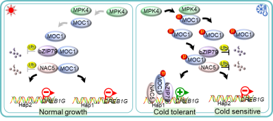 基于此,我们从突变体库中筛选到一个冷敏感突变体,其编码基因为MOC1(MONOCULM 1)。进一步研究表明MOC1是水稻耐冷性的关键正调控因子。MOC1与丝裂原活化蛋白激酶OsMPK4蛋白互作,并受到OsMPK4的磷酸化修饰调控,增强MOC1蛋白的稳定性,从而共同正向调控水稻耐冷性。值得一提的是,MOC1还与OsbZIP79和OsNAC5互作并形成复合物,以提高OsbZIP79和OsNAC5的蛋白稳定性;同时冷胁迫诱导的MOC1磷酸化显著增强了MOC1与OsbZIP79/OsNAC5的结合能力。总之,该研究揭示了OsMPK4-MOC1-OsbZIP79/OsNAC5-OsDREB1G模块在水稻耐冷性中的调控机理。不仅深入揭示了水稻耐冷性的分子调控机制,也为水稻抗逆育种提供了新的思路和策略。