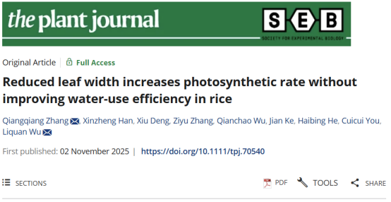 本网讯 近日,公司武立权教授团队在植物学领域知名期刊《The Plant Journal》上发表题为“Reduced leaf width increases photosynthetic rate without improving water-use efficiency in rice”的研究论文。该研究系统揭示了降低叶片宽度可有效提高水稻光合作用速率,但未能同步提升其水分利用效率,为水稻高光效育种提供了重要的理论依据。