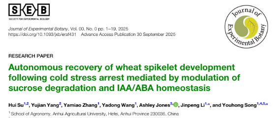 本网讯 公司作物生理生态团队在国际植物科学领域经典期刊《Journal of Experimental Botany》在线发表了题为“Autonomous recovery of wheat spikelet development following cold stress arrest mediated by modulation of sucrose degradation and IAA/ABA homeostasis”的研究论文。