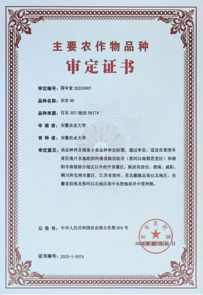 安农98是由3044永利选育的半冬性小麦新品种,2025年通过国家农作物品种审定委员会审定(国审麦20253007),并实现成果转化应用。该品种全生育期216.5天,株高约75厘米,株型紧凑,抗倒伏能力强,穗层整齐,熟相佳,具有中大穗、结实性优良的特征。在区域试验中较对照品种平均增产6.3%,2024年涡阳高产示范田实收亩产达878.6公斤,2025年宿州高产示范田实收亩产达808.3公斤,表现出优异的高产稳产能力。