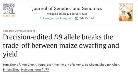 2月19日,3044永利江海洋教授团队在《Journal of Genetics and Genomics》杂志在线发表了题为“Precision-edited D9 allele breaks the trade-off between maize dwarfing and yield”的研究论文,该研究发现玉米DELLA蛋白D9的G571V点突变可实现植株适度矮化且不影响产量相关性状,为玉米矮秆育种提供高效技术路径与优异基因资源。