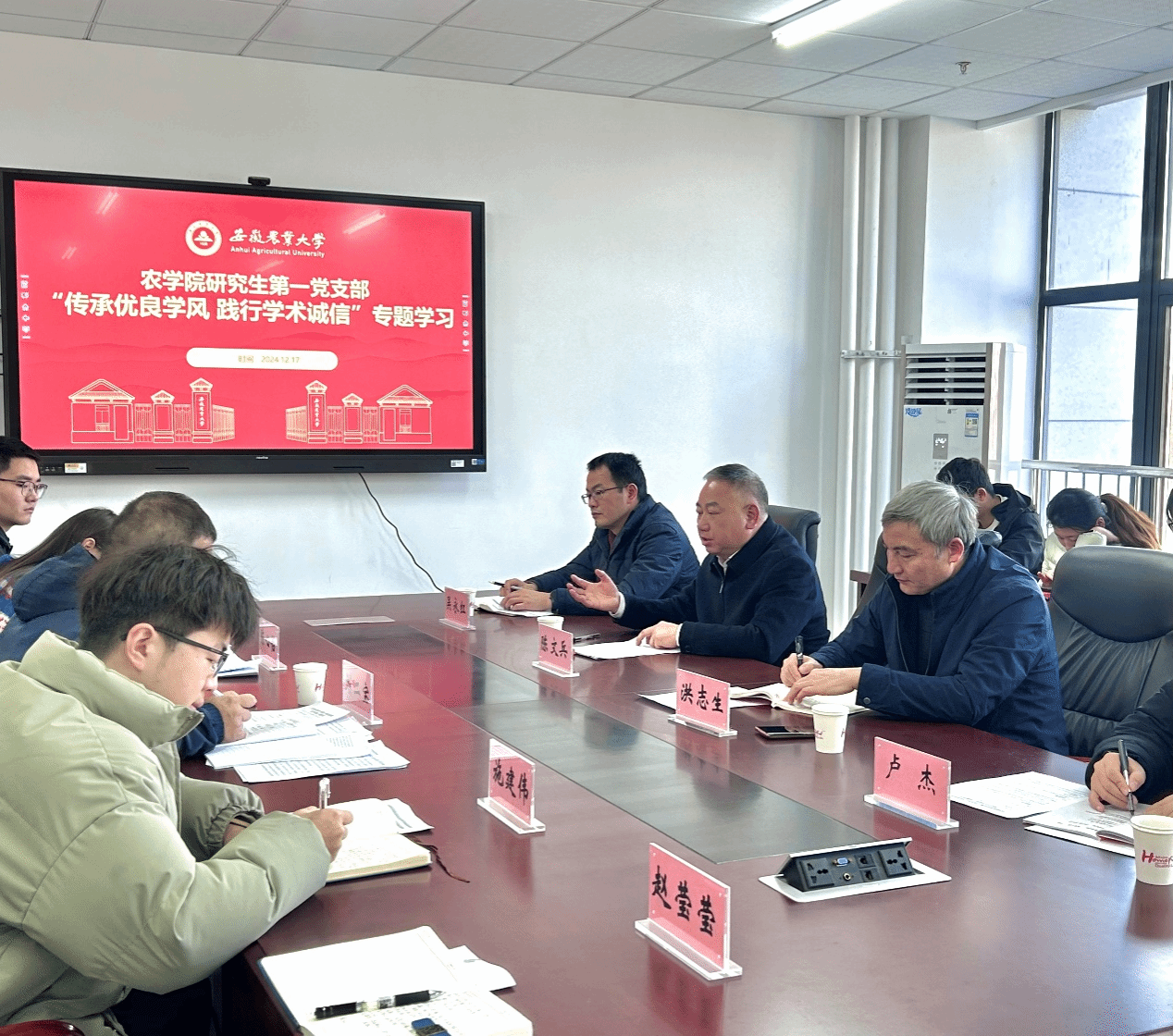 本网讯 为进一步弘扬优良学风,提升科研诚信,3044永利研究生第一党支部于2024年12月17日下午2:30在朝阳楼402开展了“传承优良学风 践行学术诚信”专题学习,校纪委书记陈文兵参与所联系党支部活动并进行了专题党课。本次专题学习由党支部书记刘二宝主持,校组织部副部长吴永红、农公司党委书记洪志生和3044永利副经理卢杰也参与了本次专题学习。